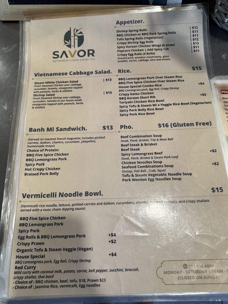 At Savor Vietnamese Cuisine, diners are treated to an authentic taste of Vietnam in a casual setting. Located at 4275 Montgomery Dr, Santa Rosa, CA, this vibrant eatery specializes in beloved Vietnamese staples, offering a menu that celebrates the rich flavors of the country.